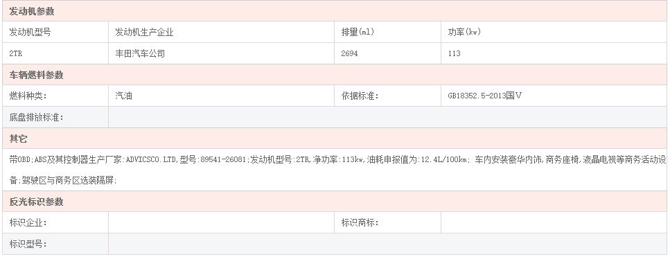BF5032XSW天坛牌商务车 联系电话:13911813291 基本参数: 排放标准:国五 车辆类型:商务车 批 次:312 燃料种类:汽油 备注说明:带OBD;ABS及其控制器生产厂家:ADVICSCO.LTD,型号:89541-26081;发动机型号:2TR,净功率:113kw,油耗申报值为:12.4L/100km; 车内安装豪华内饰,商务座椅,液晶电视等商务活动设备;驾驶区与商务区选装隔屏; 立即定制 抖音看车